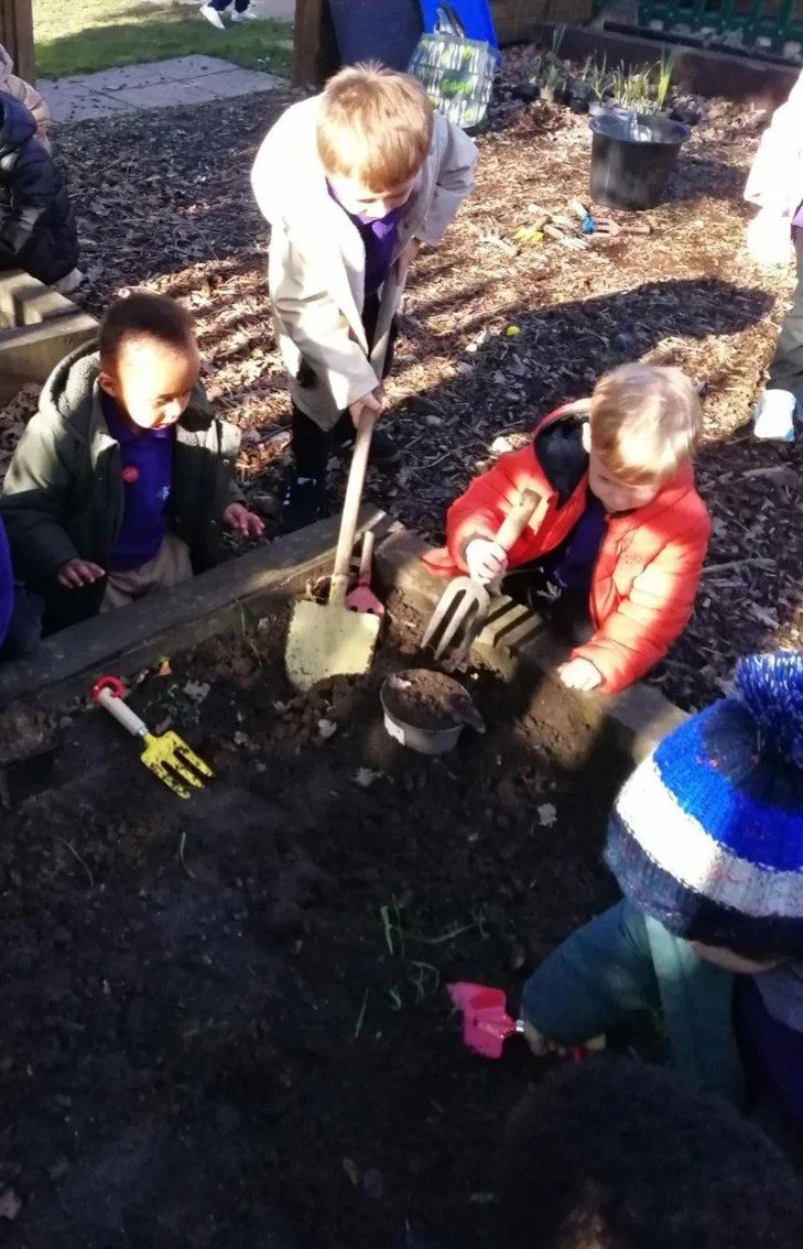 We are very lucky to have access to a community garden which we have developed into a play and nature area.